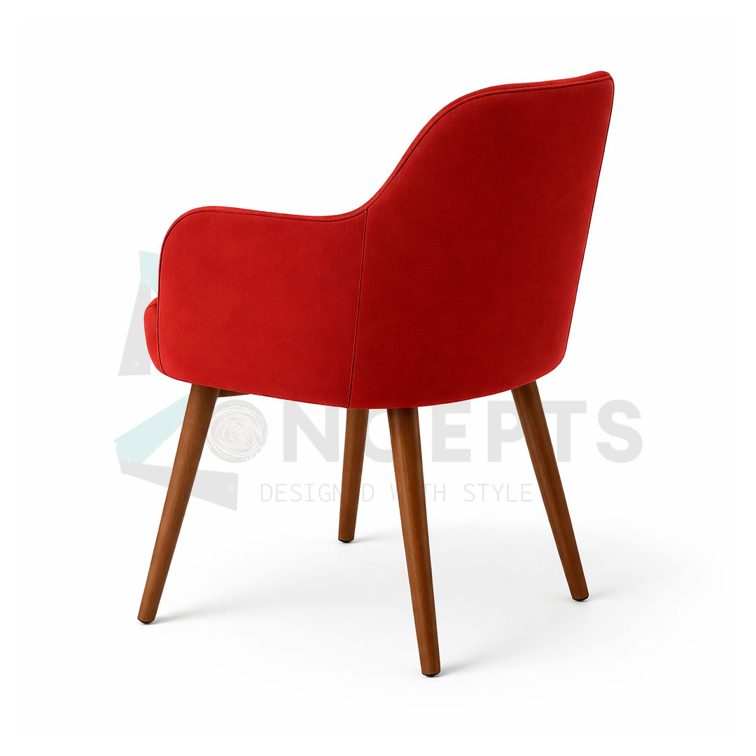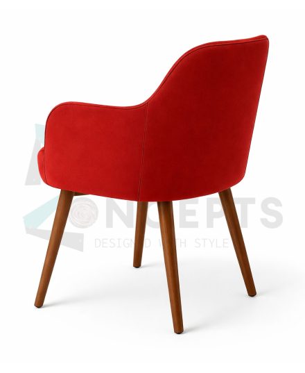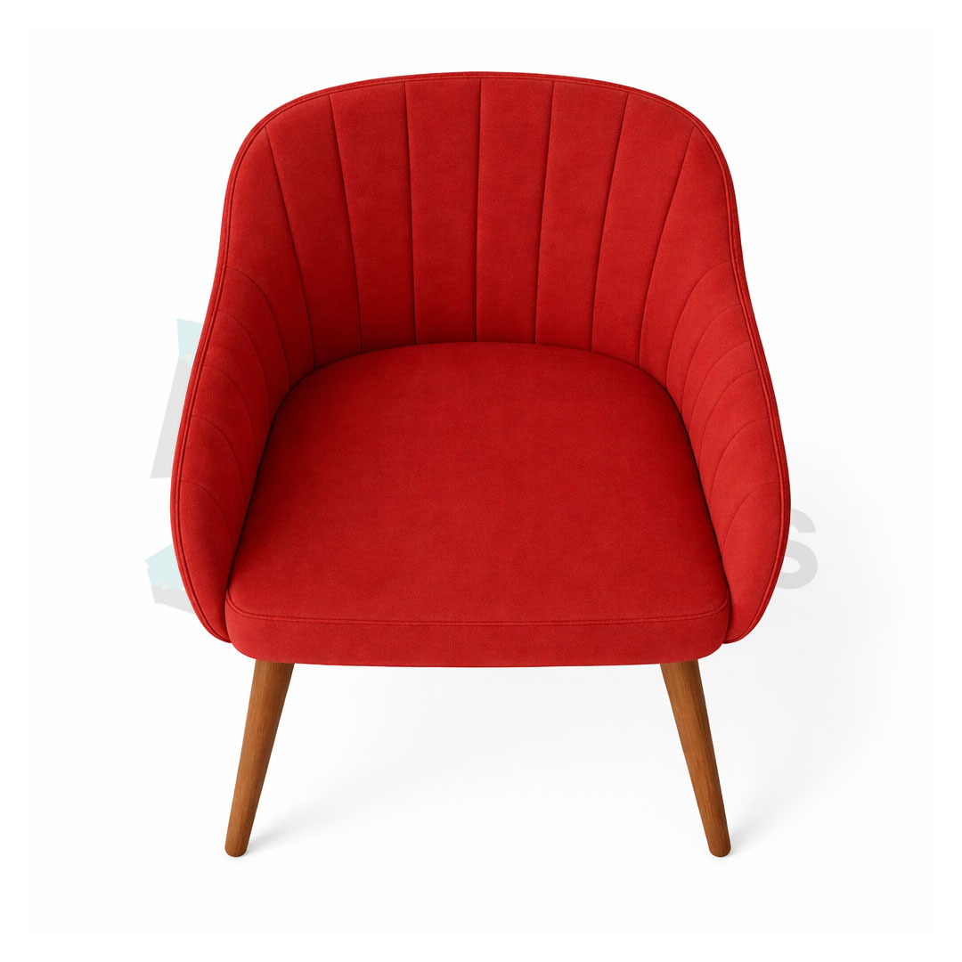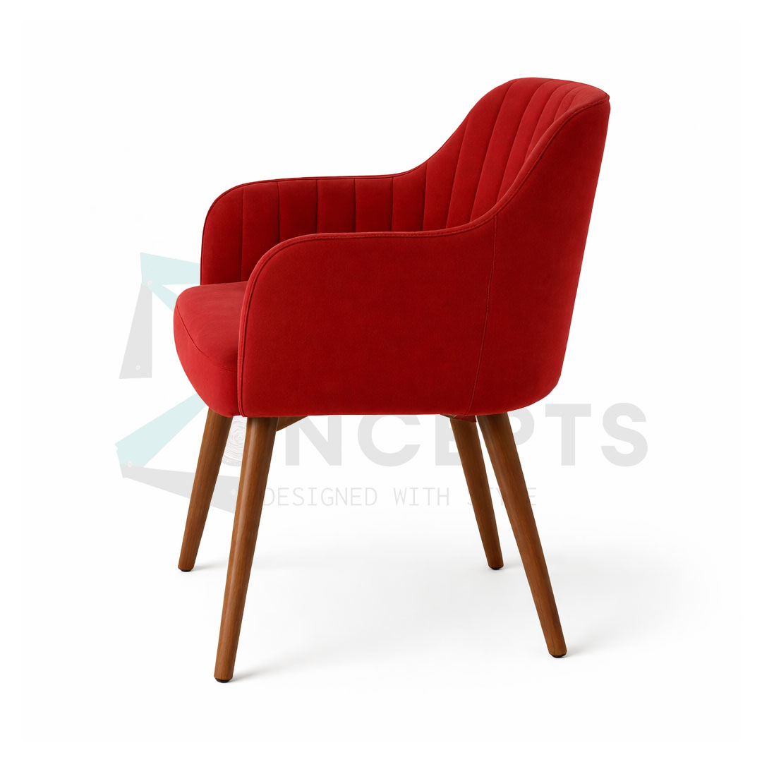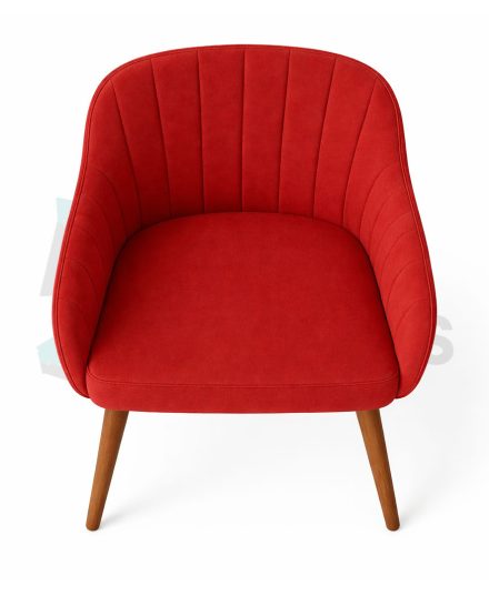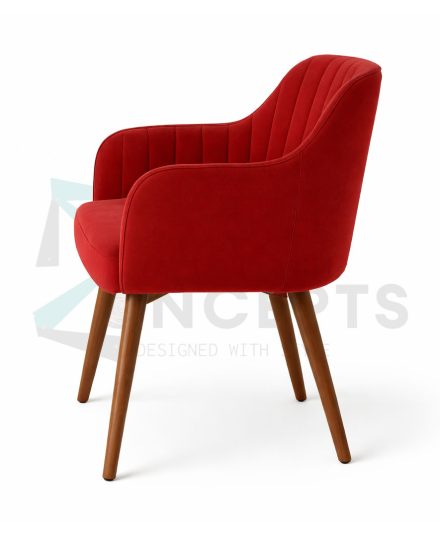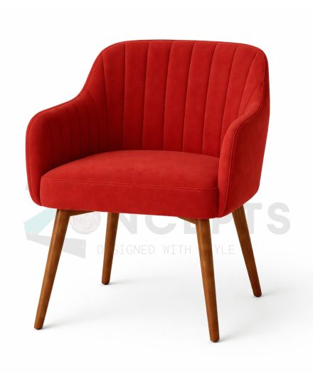 A red velvet armchair with a high back and curved arms. The chair is upholstered in a smooth, plush velvet material and has a series of vertical lines that give it a tufted appearance. It has a wooden base with four legs
